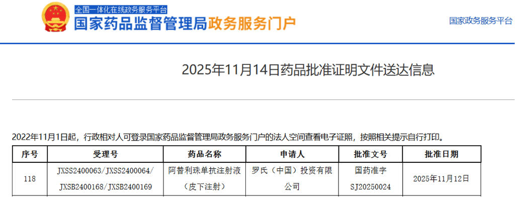 图1. 阿替利珠单抗皮下注射剂国内获批上市,来源:NMPA官网