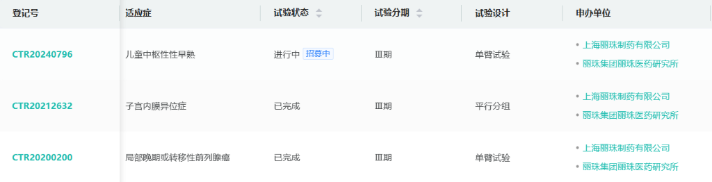 短效竞争不佳,但真正构筑行业壁垒的是长效制剂。其给药频次低、依从性好,是外企长期掌握的核心技术。从使用便利度看,一天一针无法与一月一针相比,市场自然倾向长效制剂,2024年长效制剂销售额占据该成分总市场的八成以上。然而此前国内仅有益普生与辉凌两款进口产品,属于实质垄断。直到2023年5月,丽珠集团自研的注射用醋酸曲普瑞林微球获批,成为国内首个长效制剂,并于同年进入医保。丽珠的曲普瑞林微球是2.2类改良品种,完成Ⅲ期临床试验,目前已获批前列腺癌和子宫内膜异位症适应症,儿童性早熟适应症尚在临床实验中。