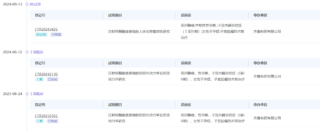 11月19日,据CDE官网信息显示,齐鲁制药以4类仿制药递交的注射用醋酸曲普瑞林上市申请已获受理。