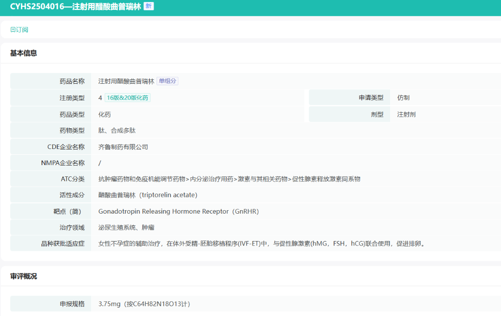根据规格判断,该产品应为长效制剂,这也意味着,齐鲁成为了国内首家以4类仿制路径提交醋酸曲普瑞林长效制剂上市申请的企业。