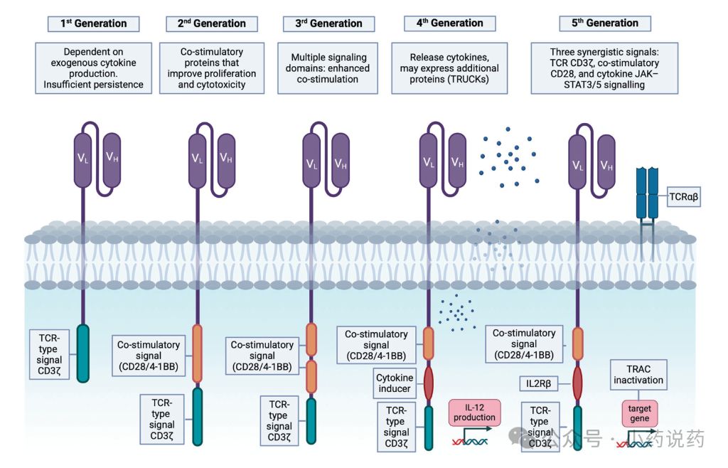 第三代CARs整合了多个信号域,包括CD28、4-1BB、ICOS和/或OX40。第四代CAR-T细胞,也称为“T细胞重定向用于通用细胞因子介导的杀伤”或“TRUCKs”,被设计用于向肿瘤微环境释放细胞因子。