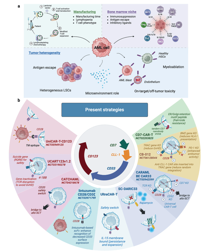 嵌合抗原受体(CAR)-T细胞疗法已彻底改变了复发/难治性(R/R)B细胞恶性肿瘤和多发性骨髓瘤的治疗格局,通过将活化的T细胞重定向至表达CD19或BCMA的肿瘤细胞来实现治疗。然而,这种方法在急性髓系白血病(AML)这一成人中最常见的急性白血病中尚未获得批准。同时,CAR-T细胞疗法在实体瘤治疗中持续面临重大挑战。在AML中开发CAR-T细胞疗法的主要挑战在于缺乏一个既有效又安全的理想靶抗原,因为AML细胞与健康的造血干细胞和祖细胞共享大多数表面抗原。同时靶向AML细胞和HSPC上的抗原表达可能导致危及生命的靶向/脱肿瘤毒性,例如延长的骨髓消融。此外,AML肿瘤微环境的免疫抑制性质对免疫反应产生不利影响。